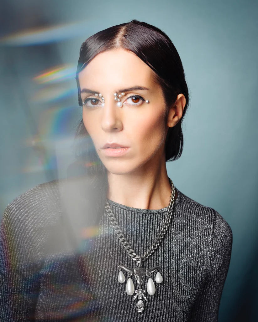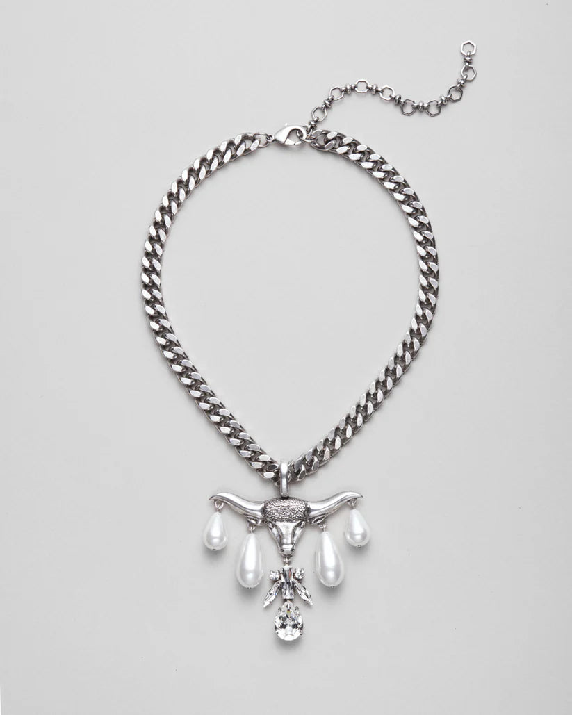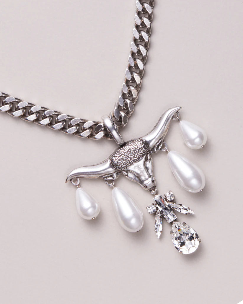 Son pendentif tête de bison est rehaussé avec des cristaux et des perles qui créent une esthétique luxueuse et opulente.
