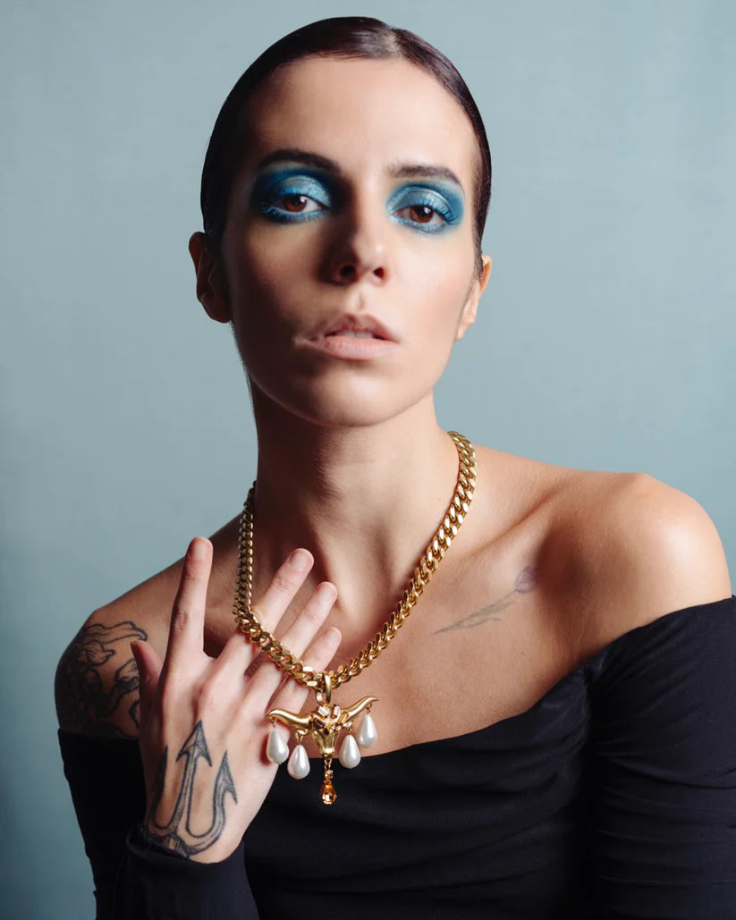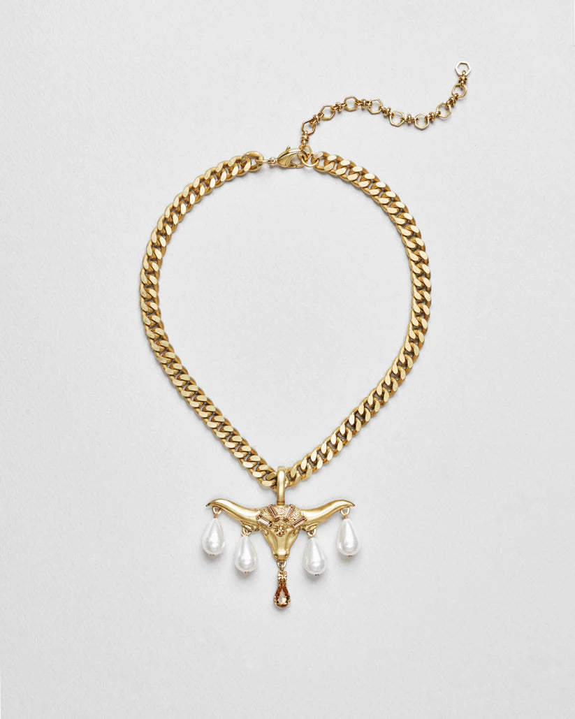 Son pendentif tête de bison est rehaussé avec des cristaux et des perles qui créent une esthétique luxueuse et opulente.