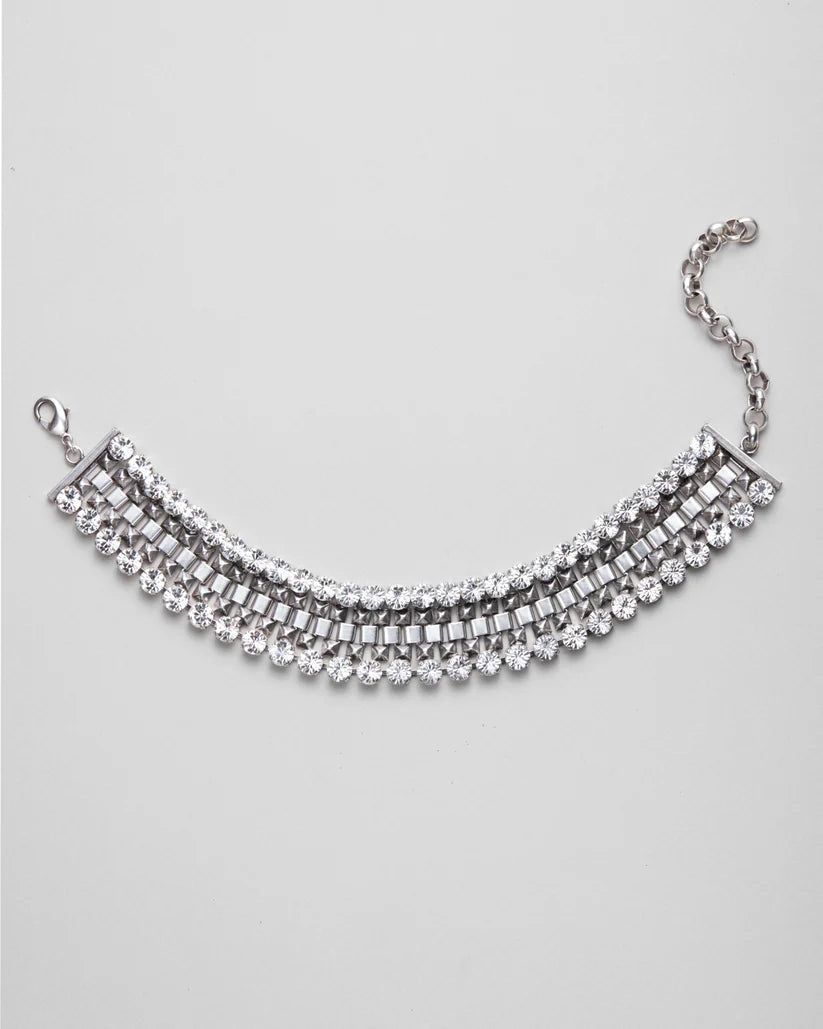 Ce ras de cou, avec sa superbe chaine studs triple rangs bordée de cristaux et ses détails étincelants en font l'une des pièces de notre collection la plus intemporelle.