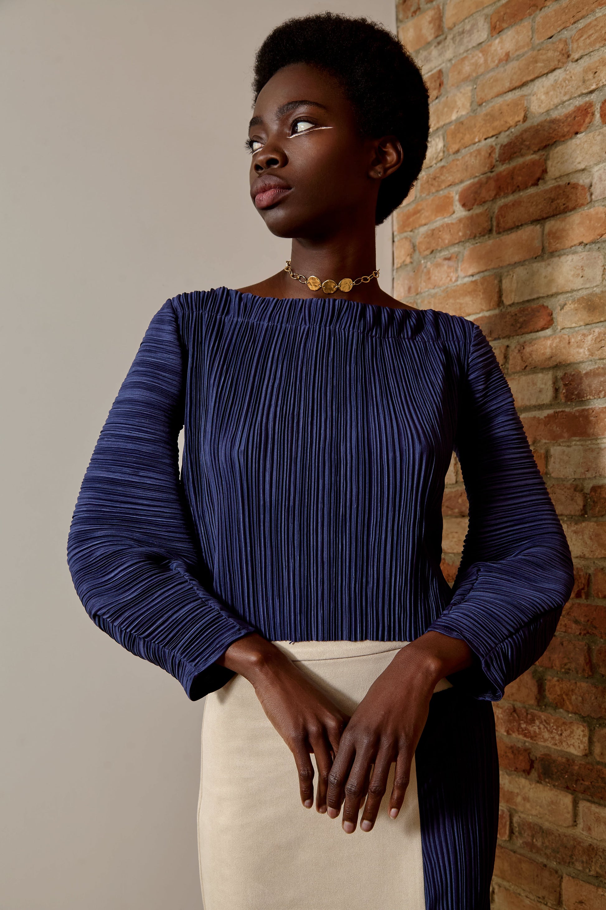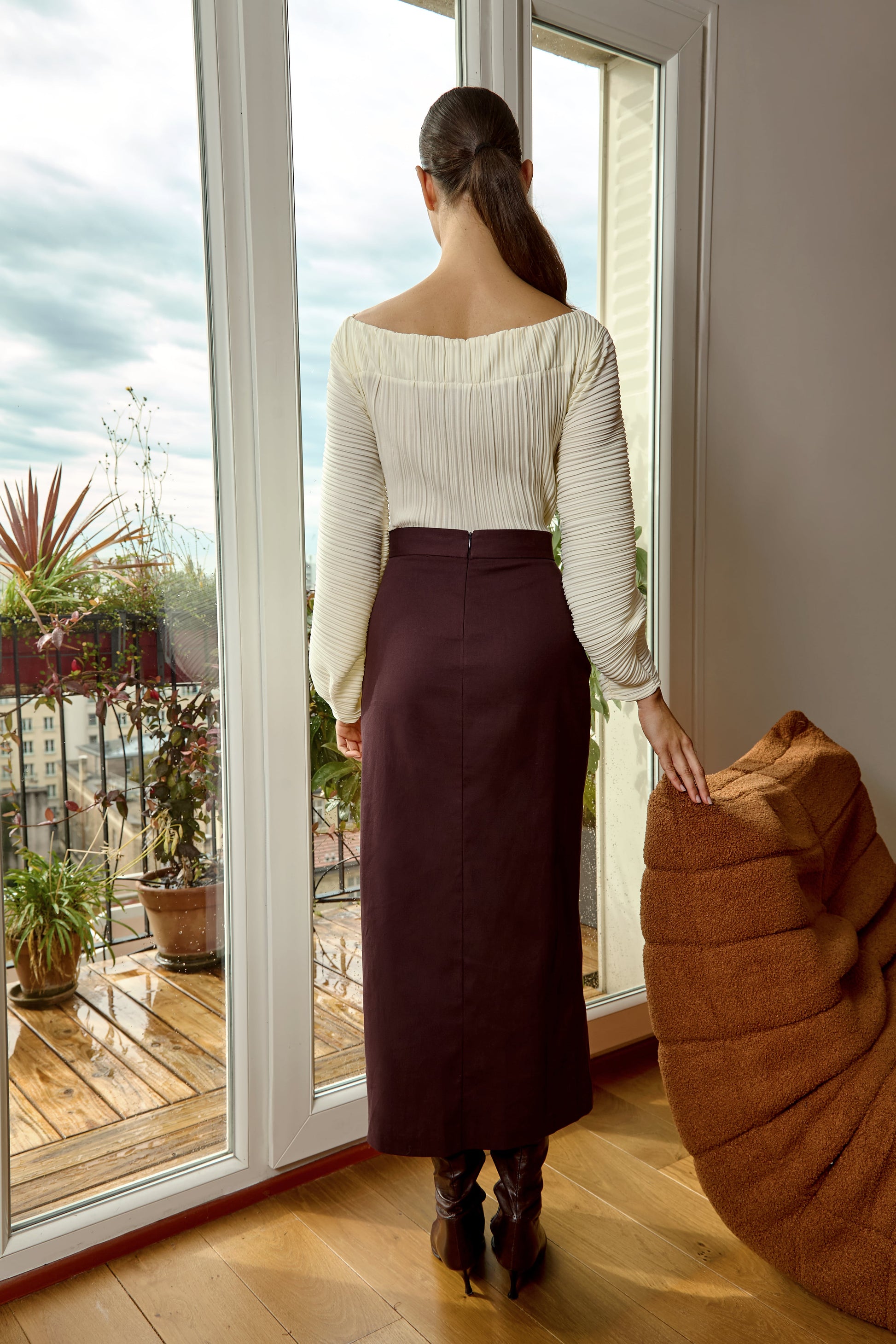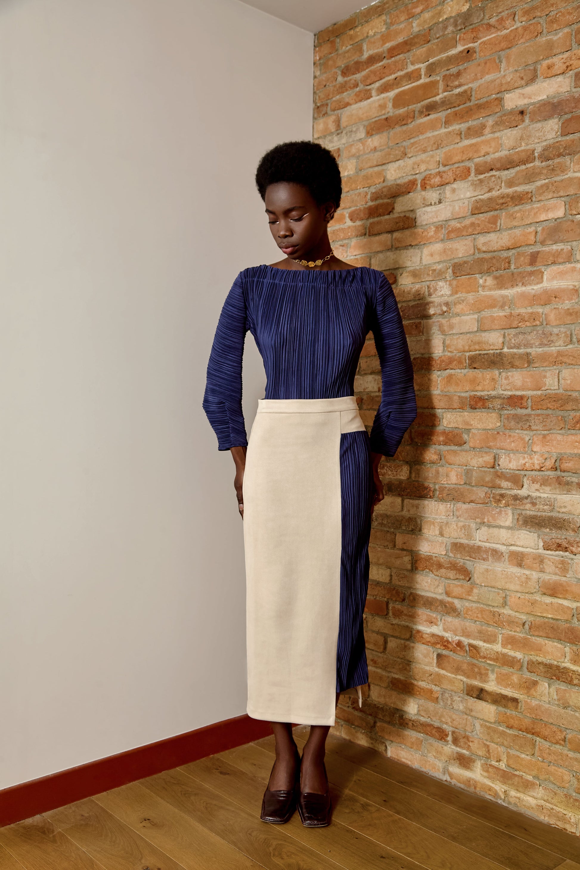 Jupe asymétrique en matières mixtes : maille recyclée et tissu plissé.