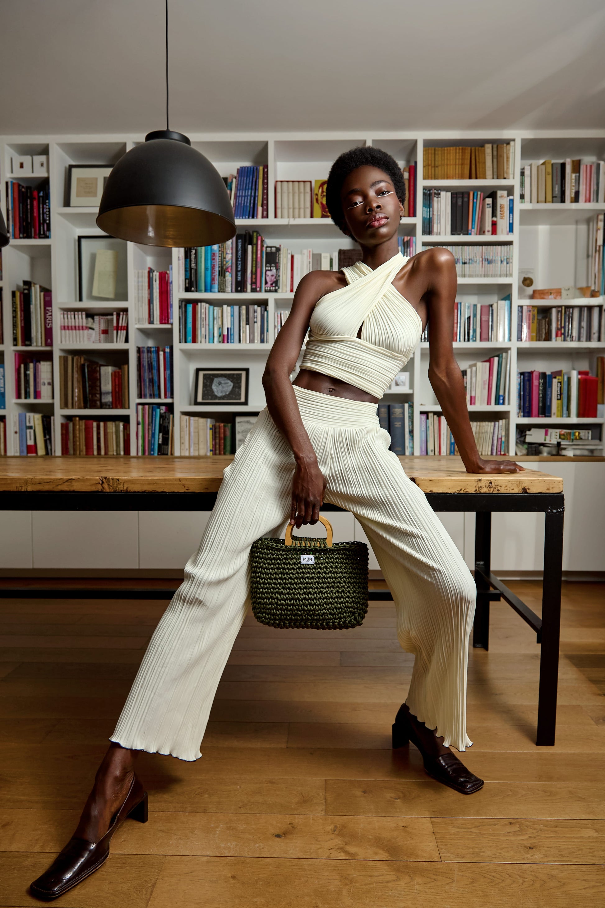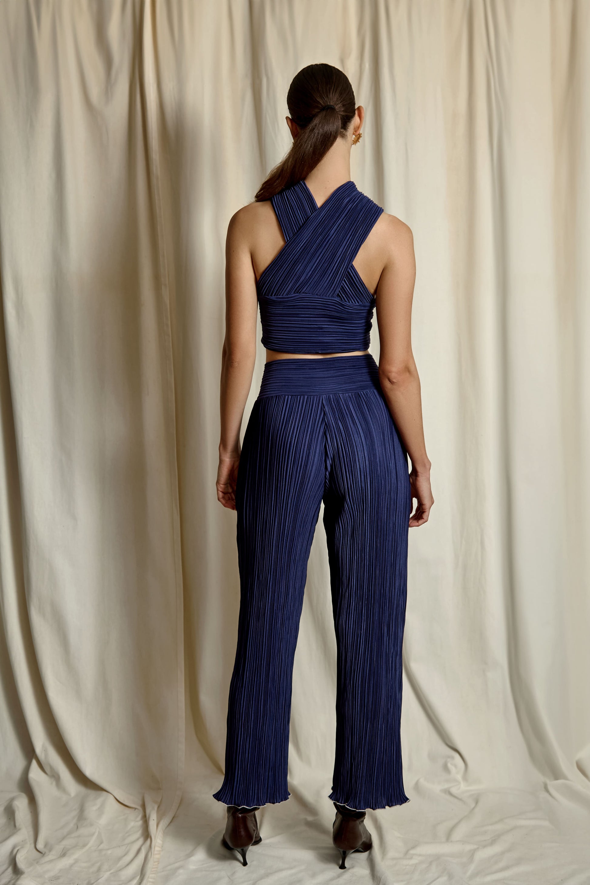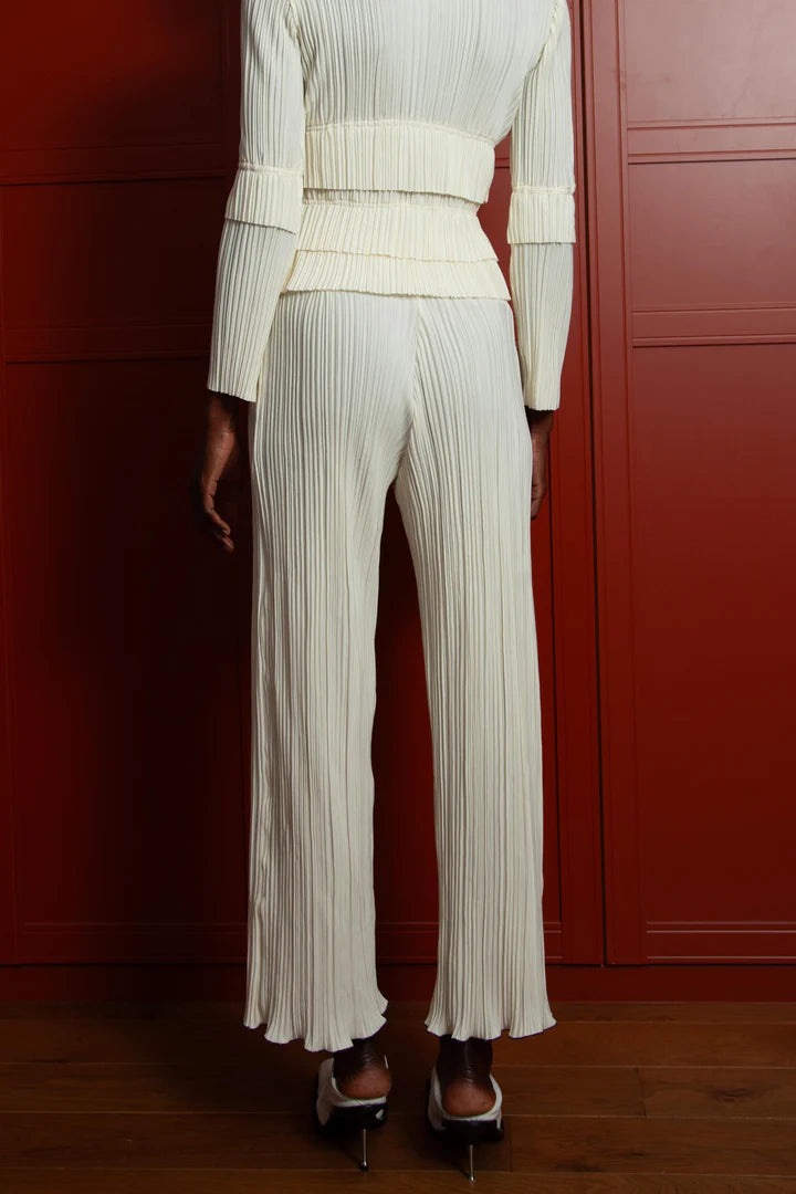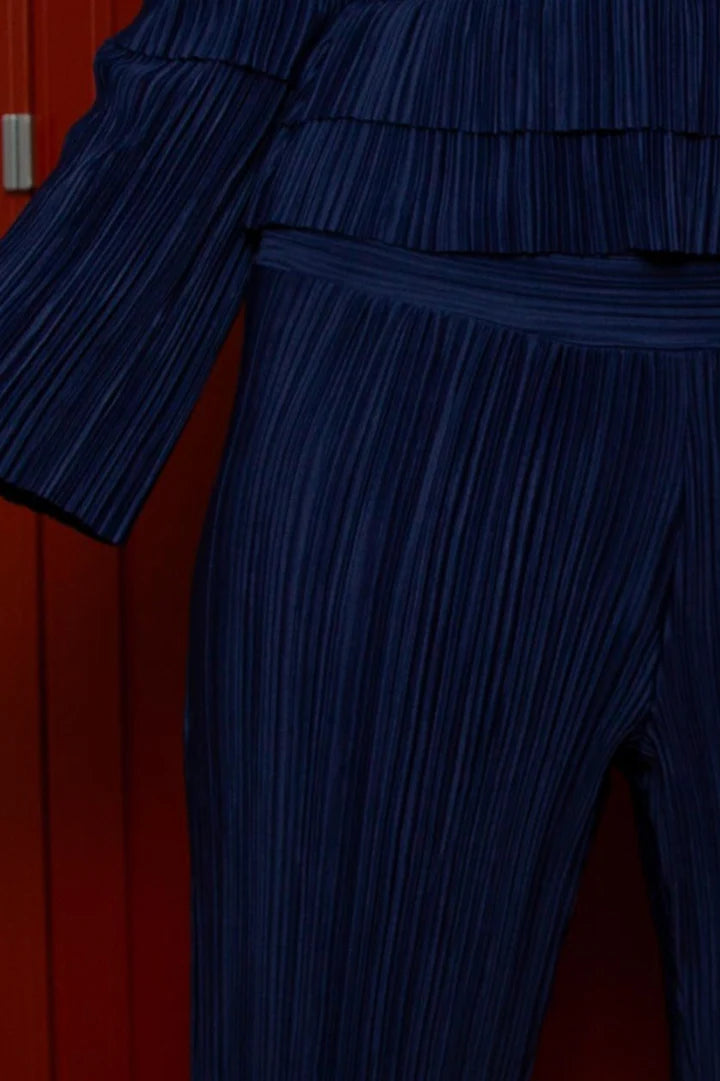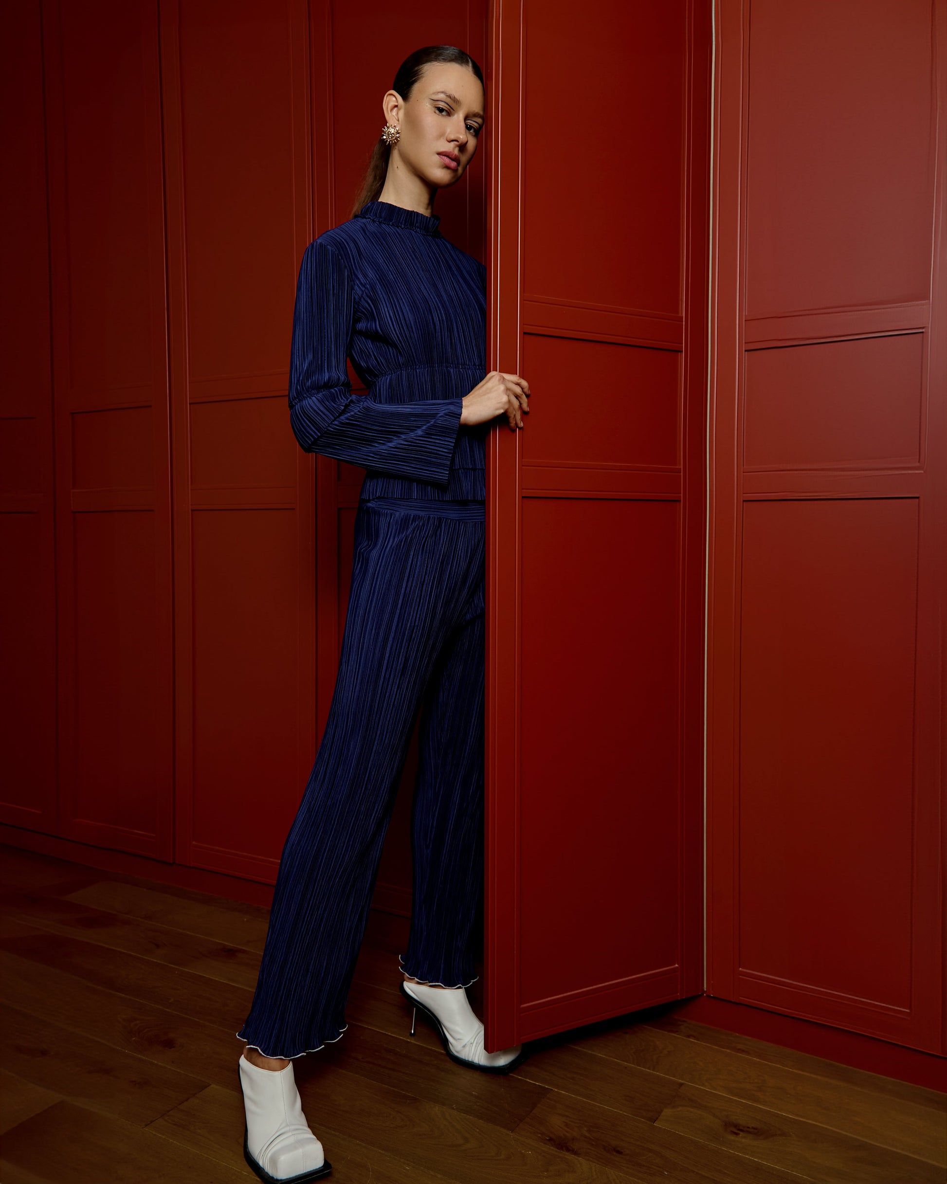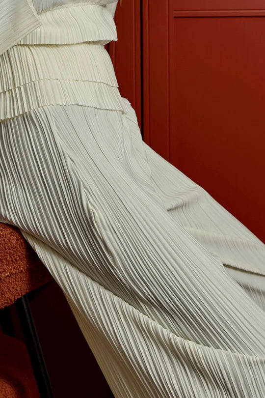 Pantalon plissé taille haute avec ceinture élastique et finition délicate dans une teinte contrastée.