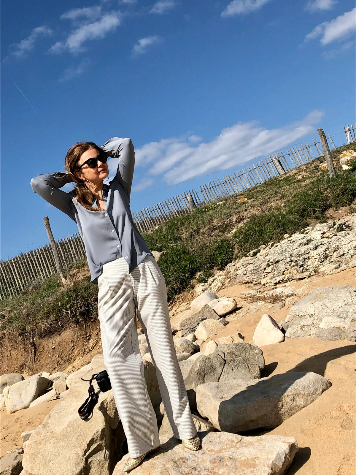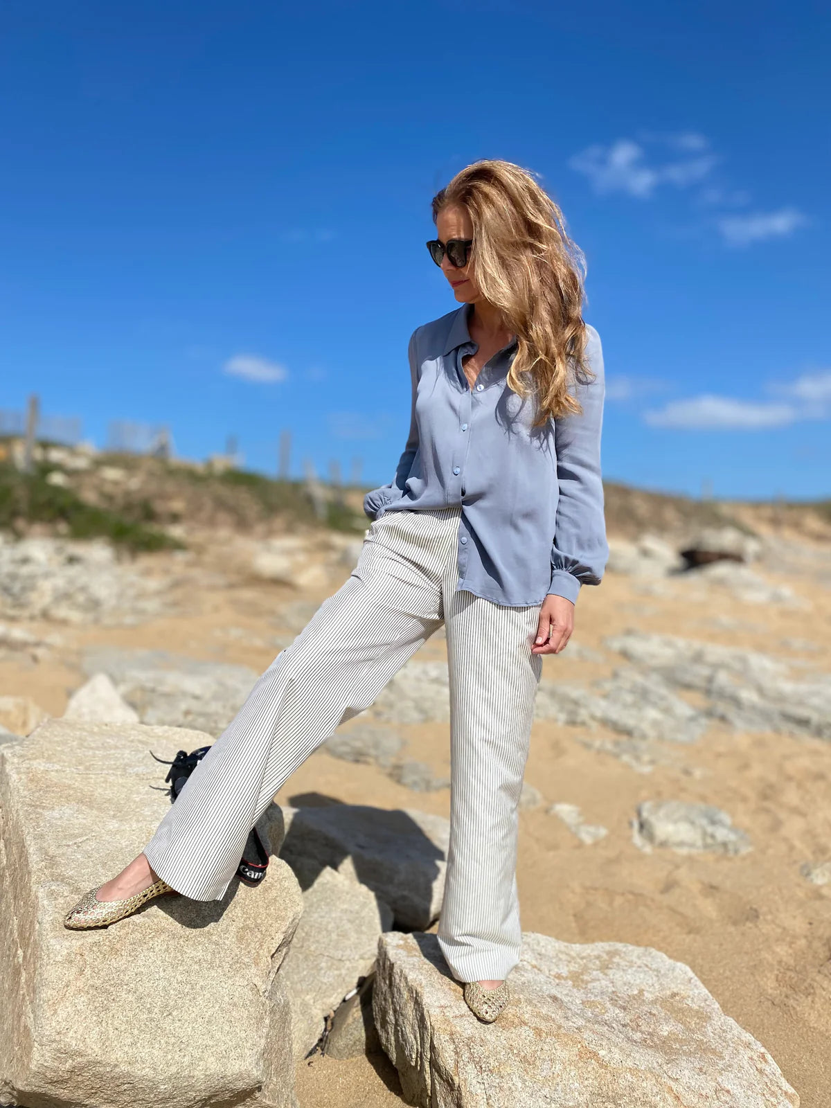 Notre premier pantalon dévoile une coupe intemporelle qui allonge la silhouette et donne une allure qui sublimera toutes les femmes. Ici, enpopeline de soie rayée, il apporte une touche de douceur.