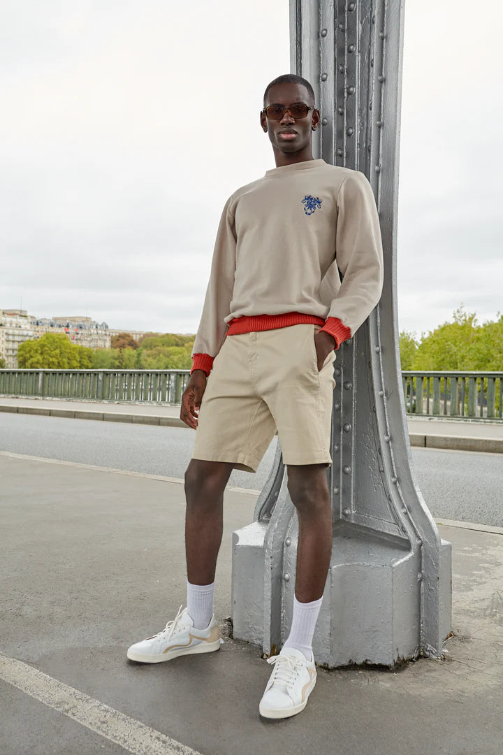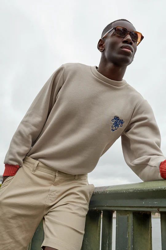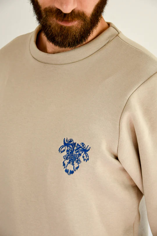 Pull à col ras du cou avec broderie de masque de diable sur la poitrine et poignets côtelés pour un style distinctif.
