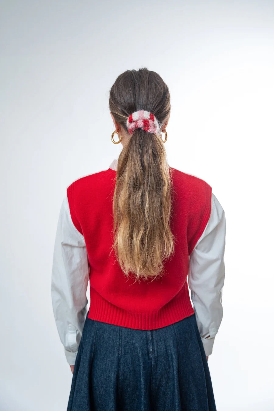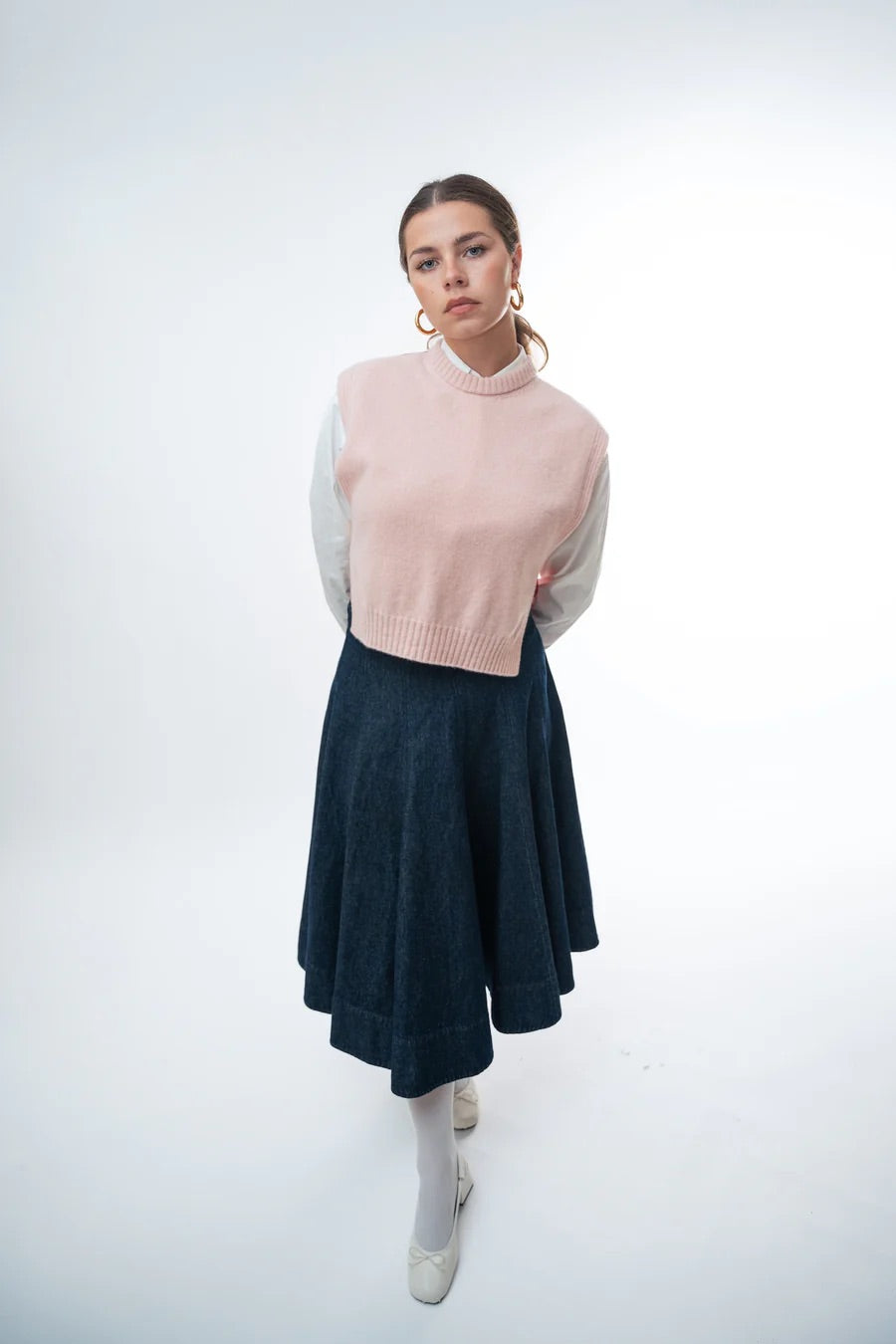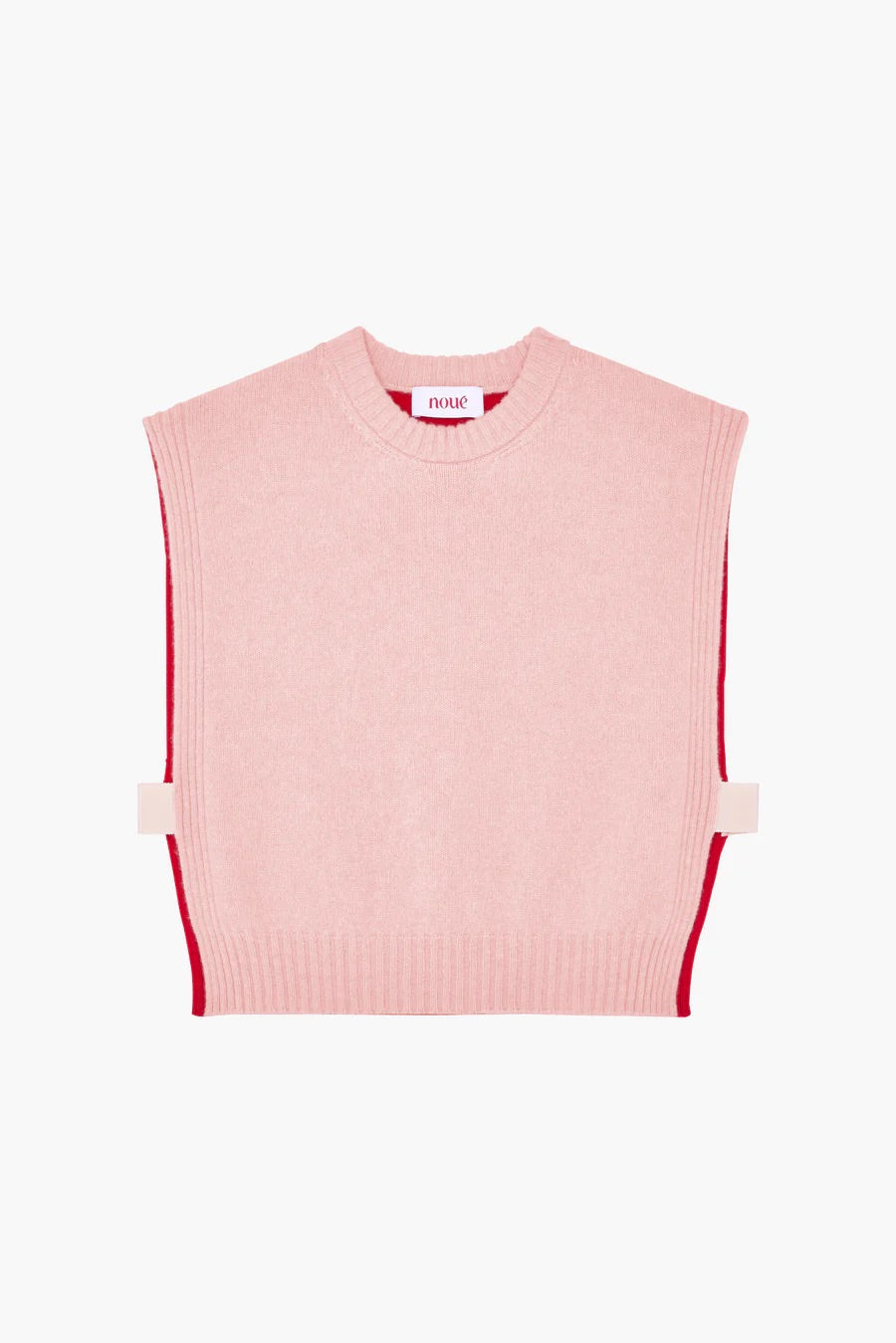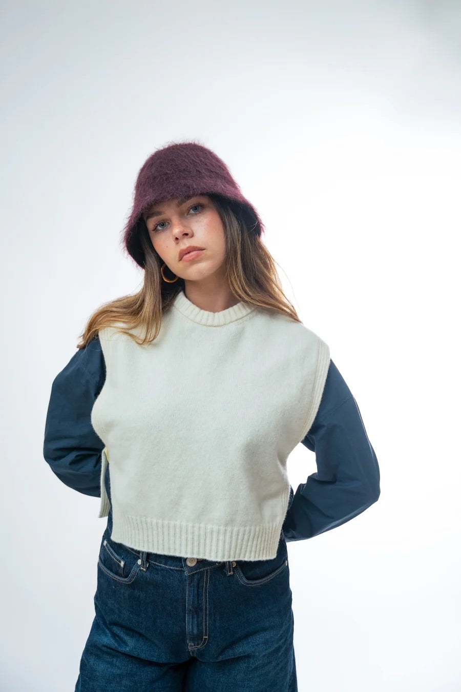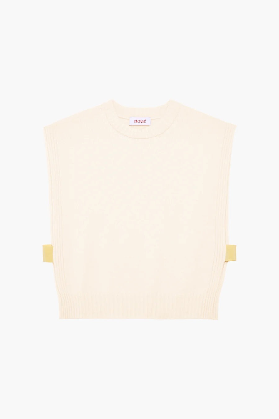 Le modèle Rumi est un pull sans manches en laine mérinos, ouvert sur les côtés dans un style poncho.