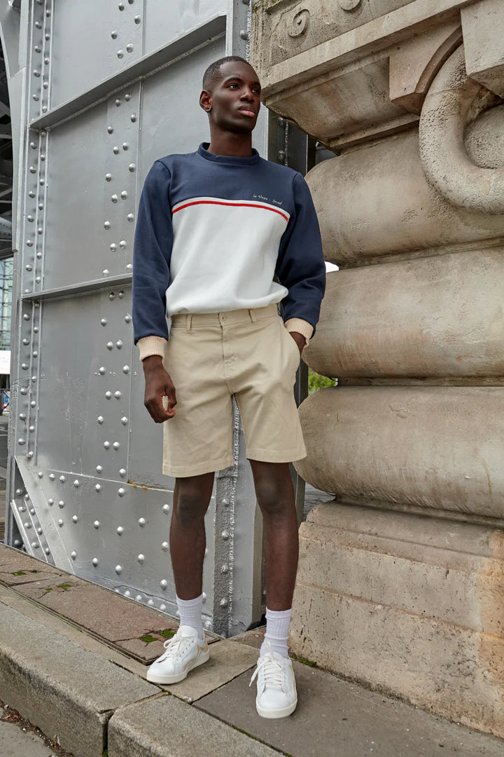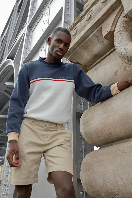 Col ras du cou tendance en matériaux mixtes, avec broderie "La Vega - Seoul" sur la poitrine et poignets côtelés beiges.