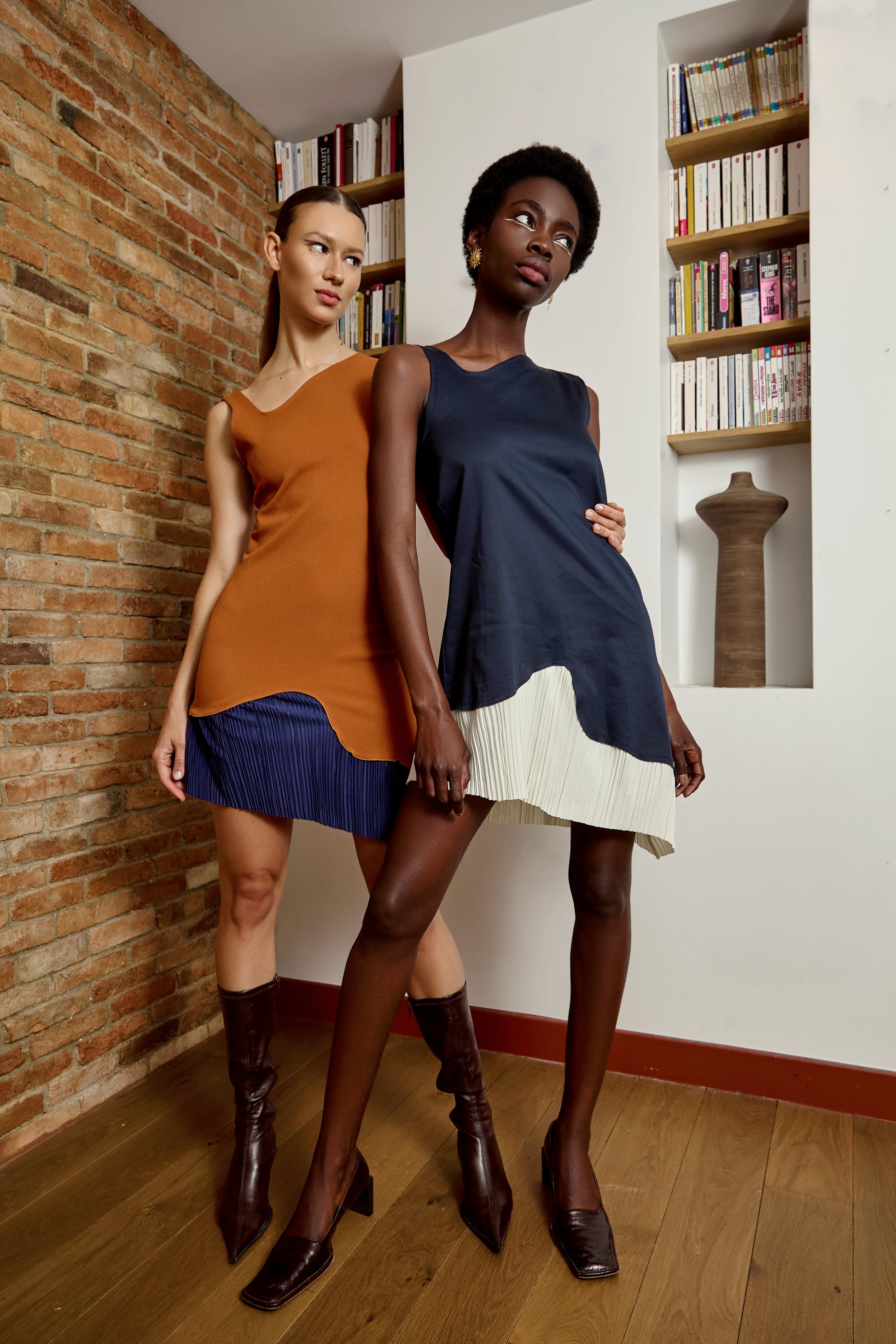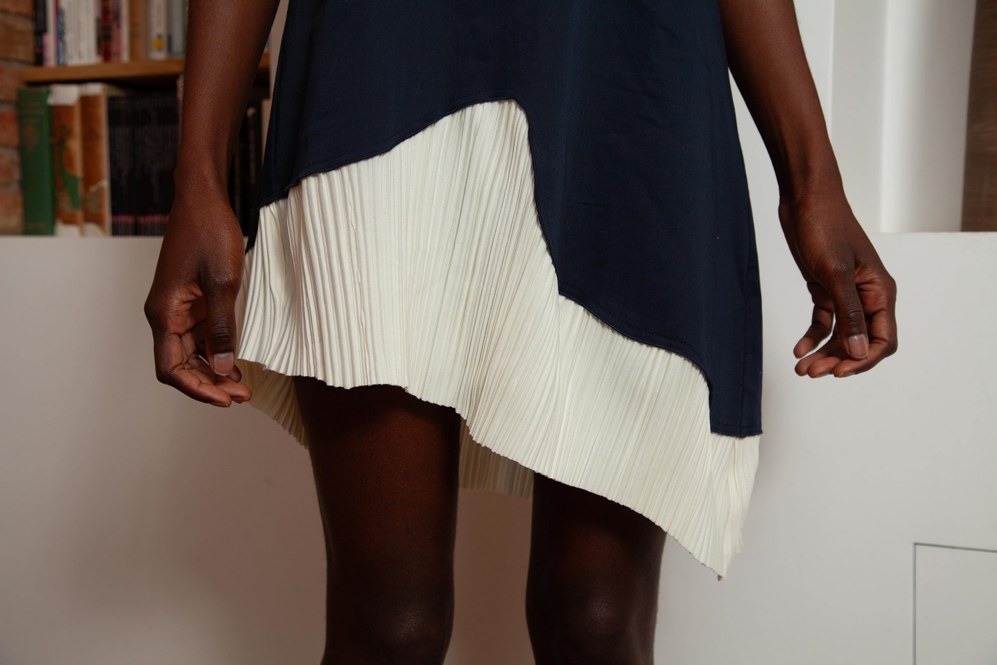 Robe asymétrique, matières mélangées : coton et tissu plissé.