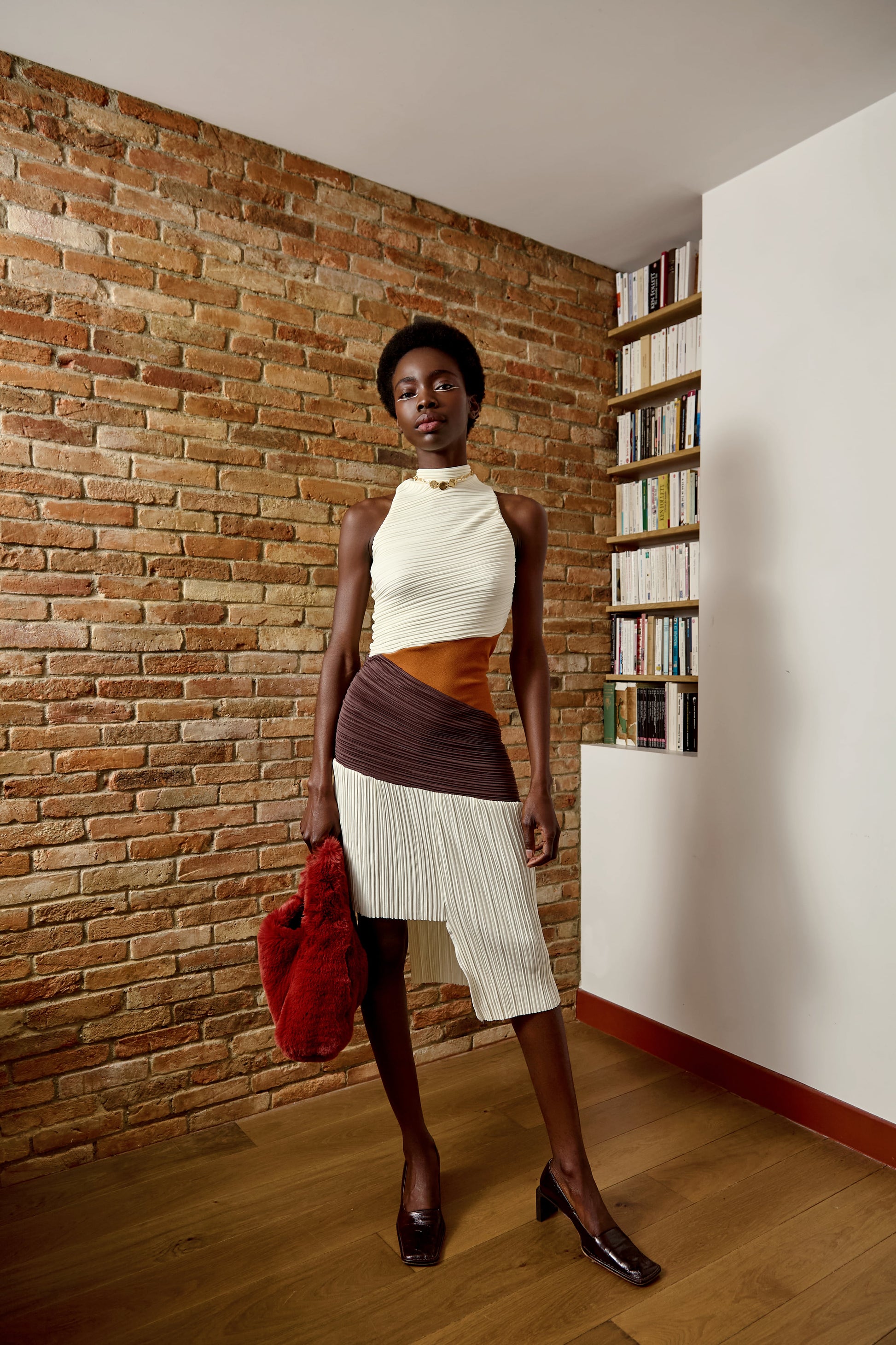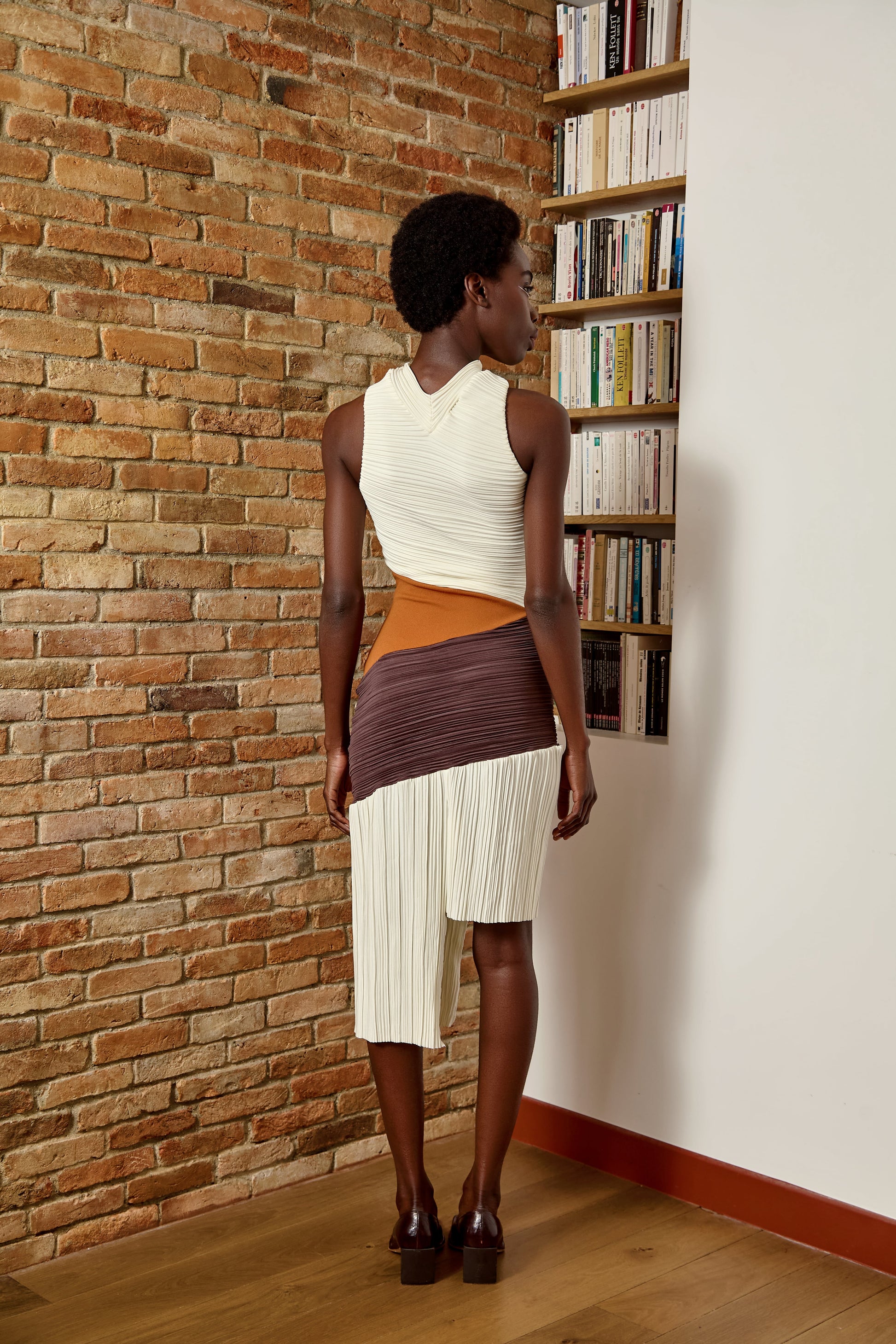 Robe asymétrique, matières mélangées : tissu plissé et drapé. Trois tons.
