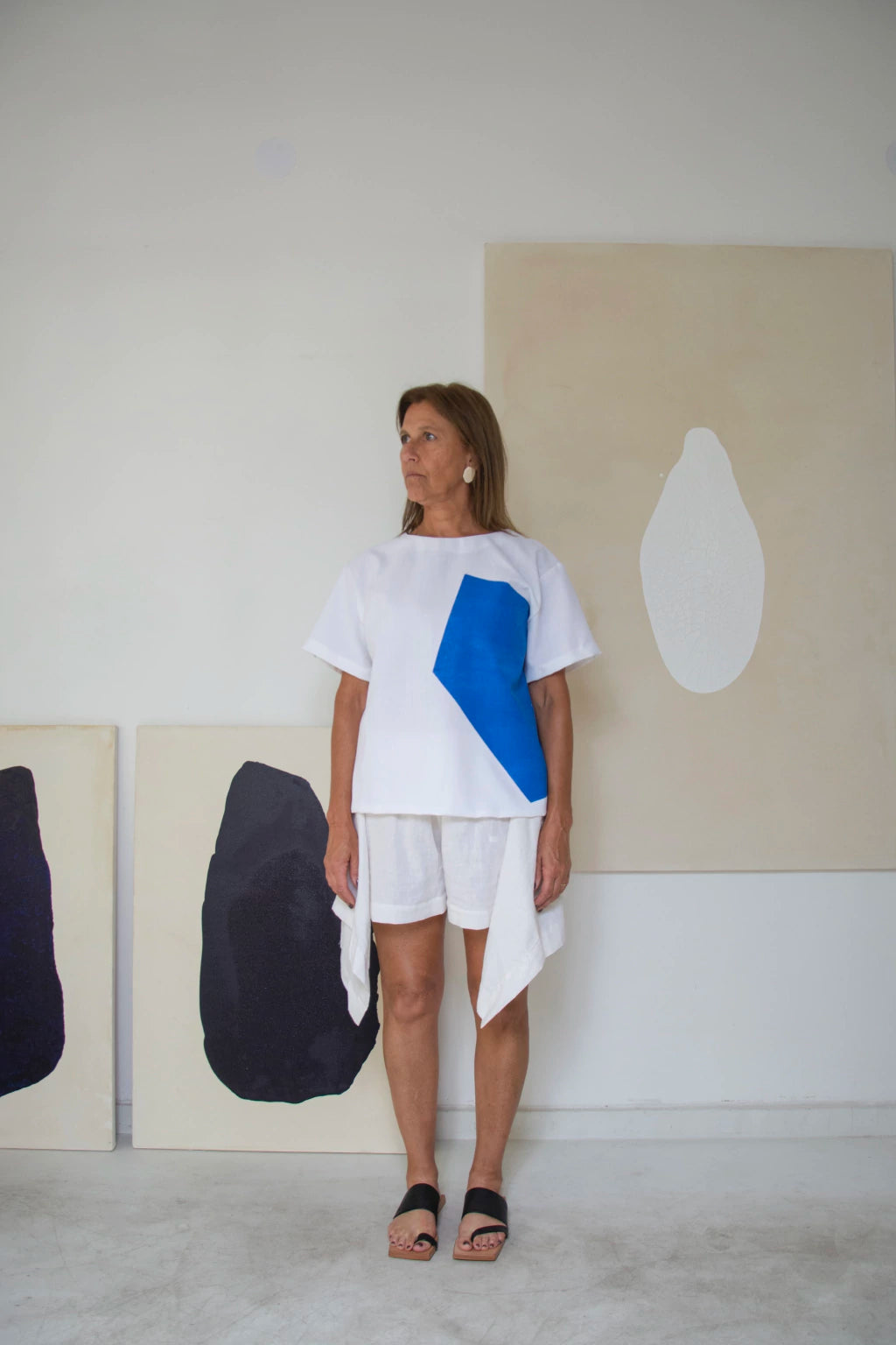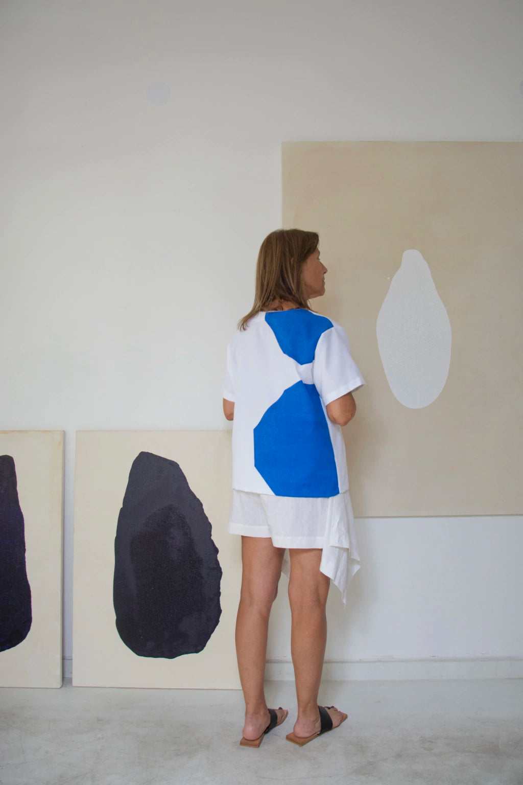 T-shirt à manches courtes en lin écru avec un imprimé unique, réalisé à la main en bleu. Toutes les finitions de ce vêtement sont réalisées à la main, sans coutures apparentes. Il s'agit d'un vêtement polyvalent, confortable, frais et surtout authentique.