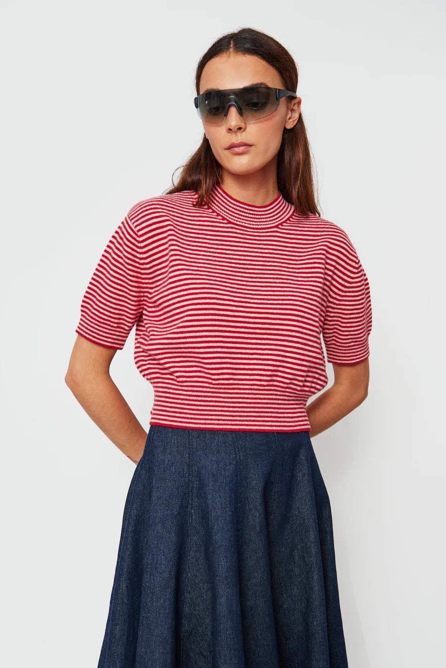 Le pull EIRA à manches 3/4 tombe juste au-dessus du coude et présente un col cheminé.