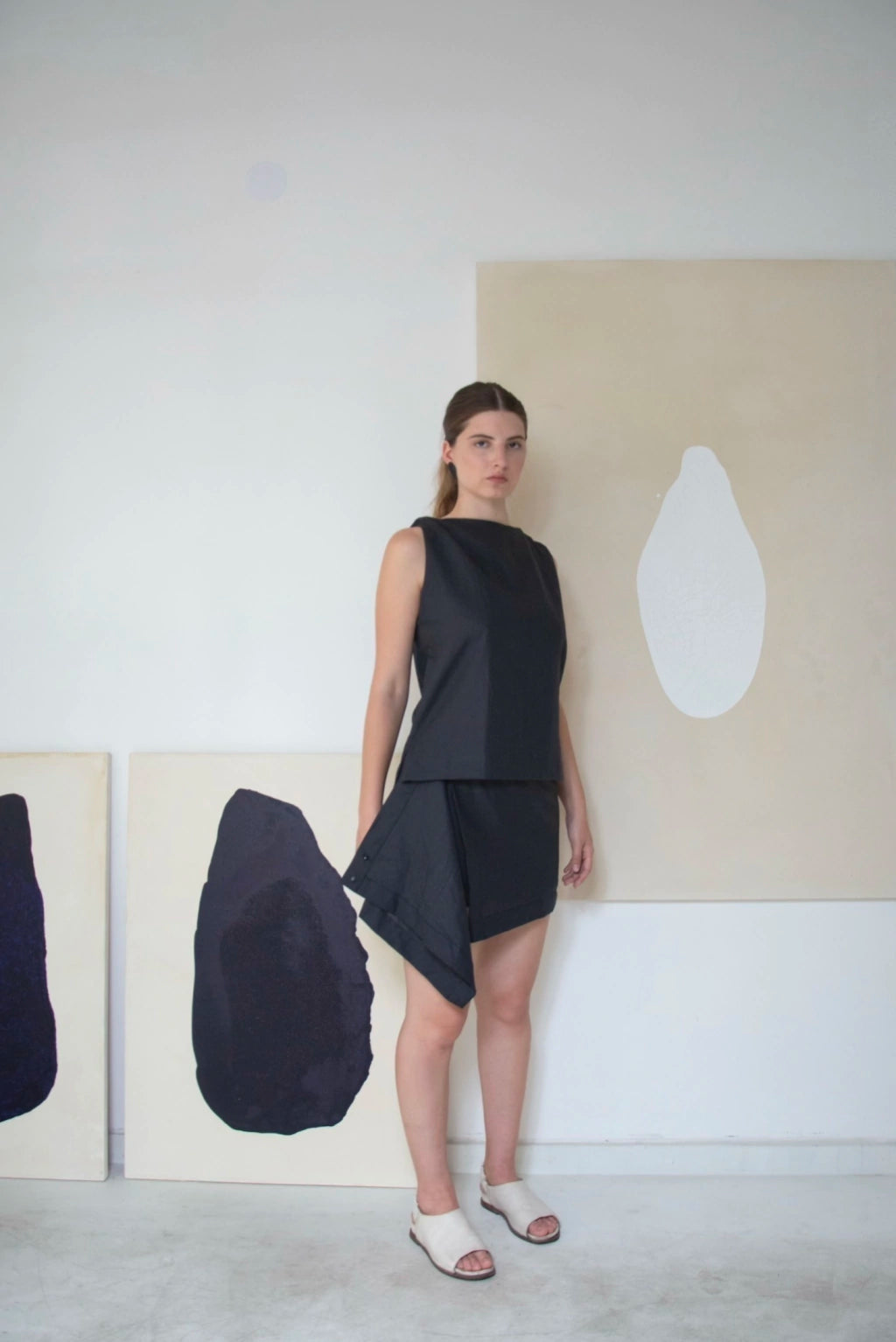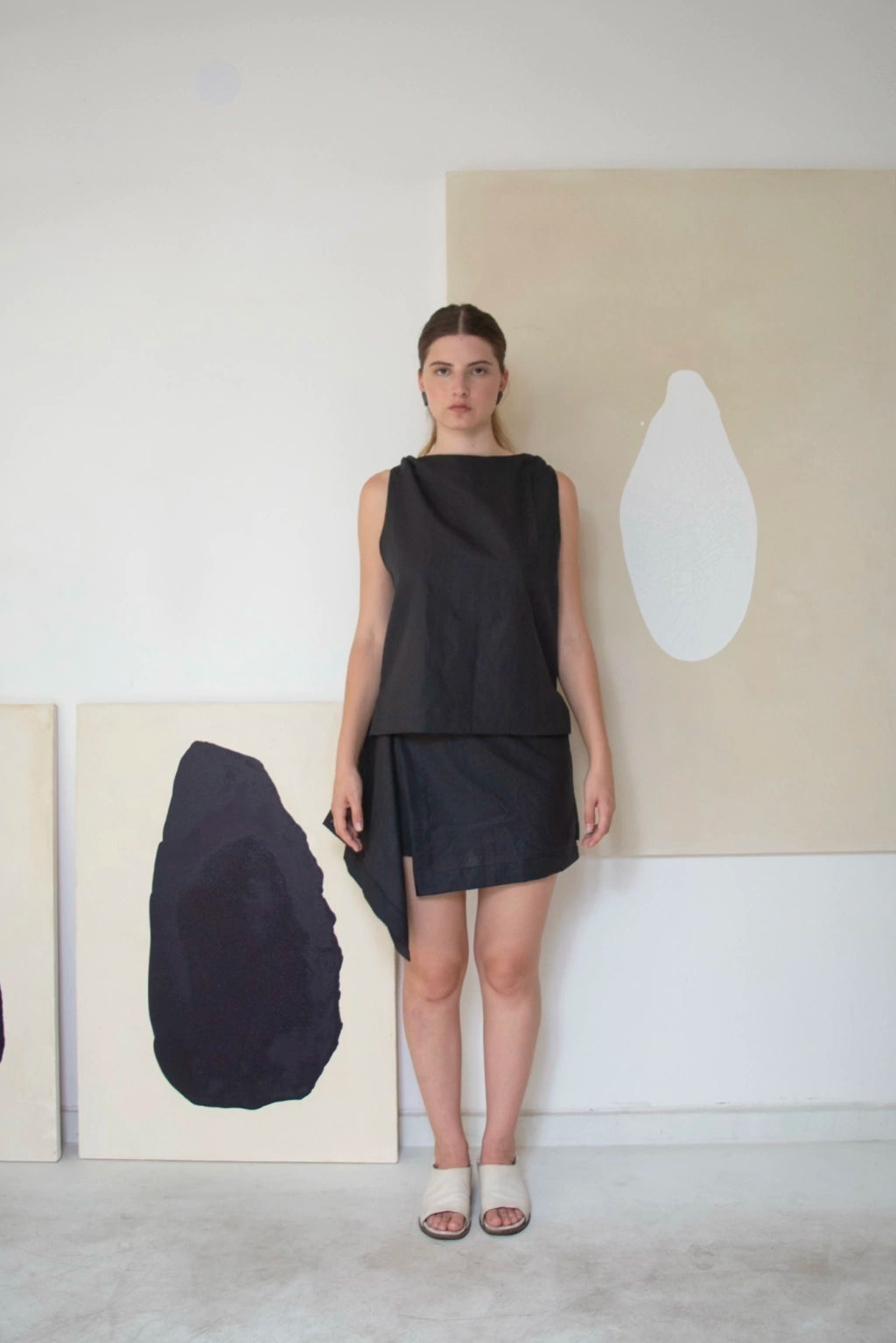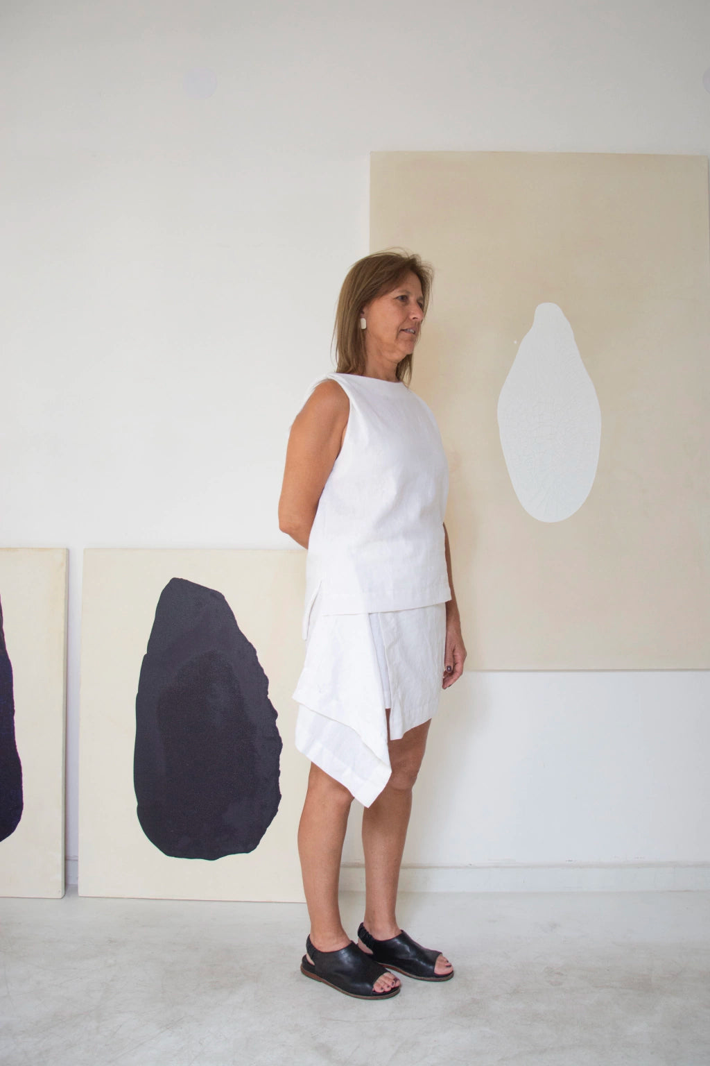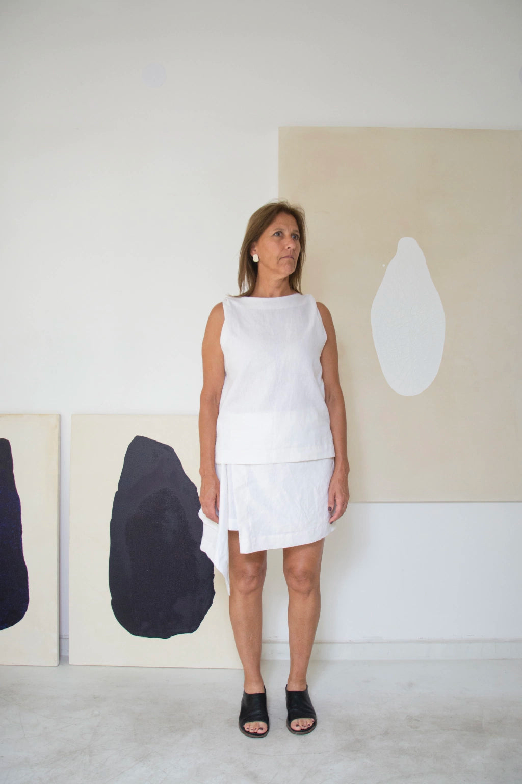 Top en lin, avec épaule finie à la main. L'épaule est à l'honneur dans cette pièce, un détail subtil qui, par sa morphologie et sa forme, stylise le corps. Il présente deux fentes latérales et le dos est plus long que le devant.