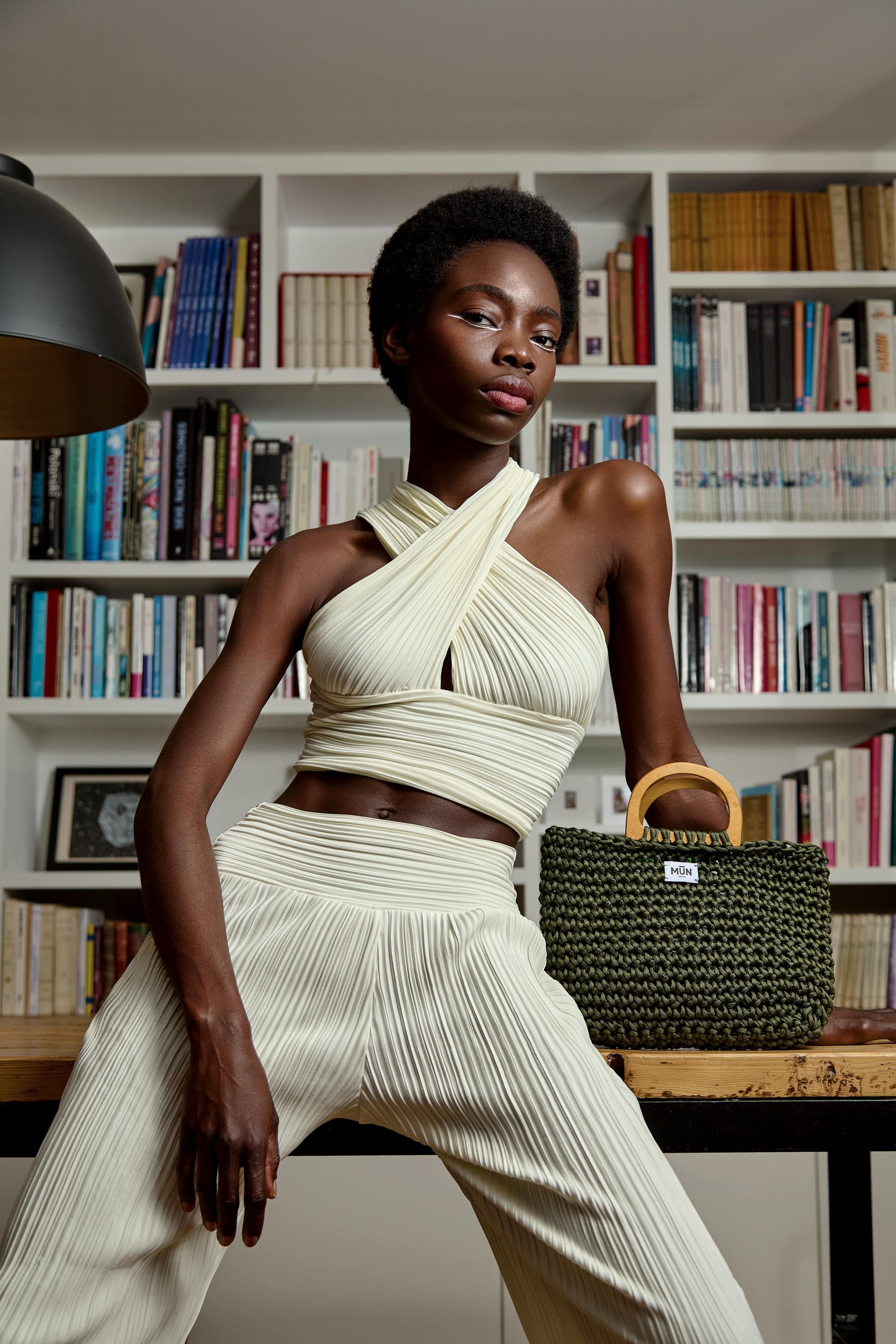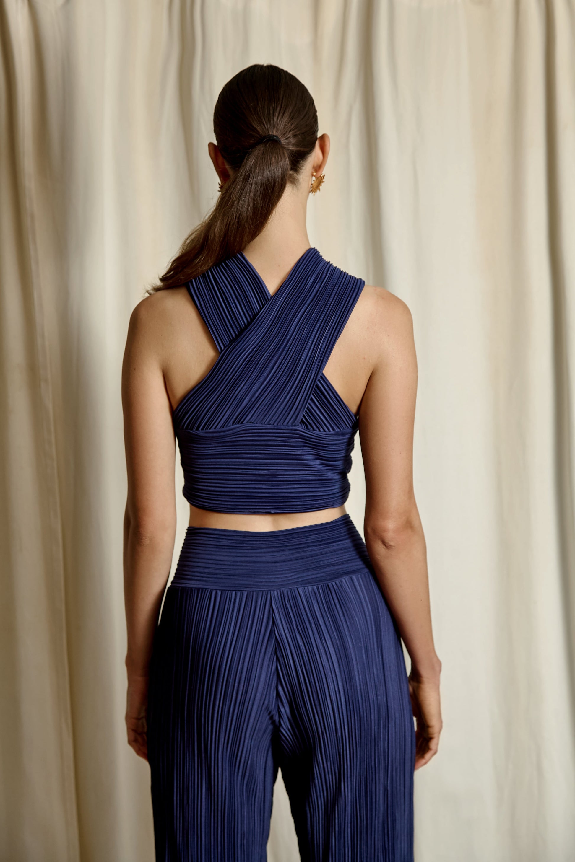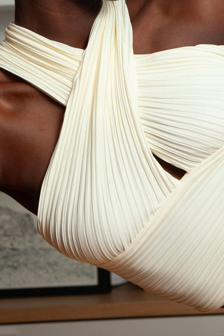 Ce crop top plissé avec un effet croisé allie des plis élégants et un détail croisé chic pour une silhouette unique et moderne.